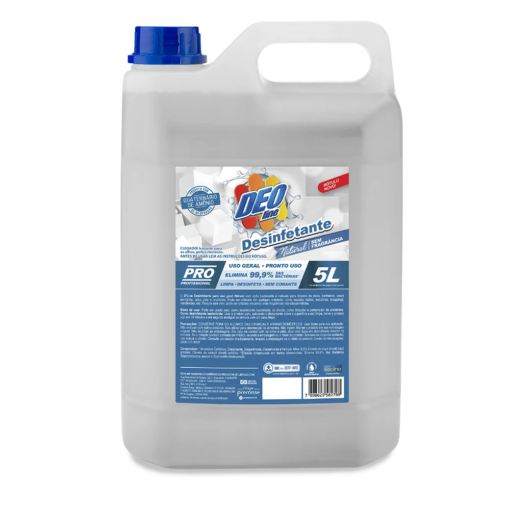 ação bactericida é indicado para limpeza de pisos, banheiros, vasos sanitários, ralos, pias e lavatórios. Pode ser utilizado em qualquer ambiente, como escolas, hotéis, indústrias, shoppings, residências, etc. Não possui fragrância ou corantes. • Ideal para uso em ambientes que não permitem o uso de produtos com fragrância. • Elimina 99,9% das bactérias Staphylococcus aureus e Salmonella choleraesuis.* • Formulado com quaternário de amônio de 5ª geração, ativo indicado pela ANVISA para o combate ao coronavírus.** *Eficácia comprovada em testes laboratoriais.